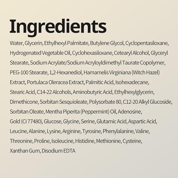 • ✔ 17 KEY INGREDIENTS: [24K gold flakes, GABA, 17 amino acids, peptides, ceramide, panthenol, hyaluronic acid, adenosine, niacinamide, centella asiatica extract, and more] for intense hydration and skin elasticity.