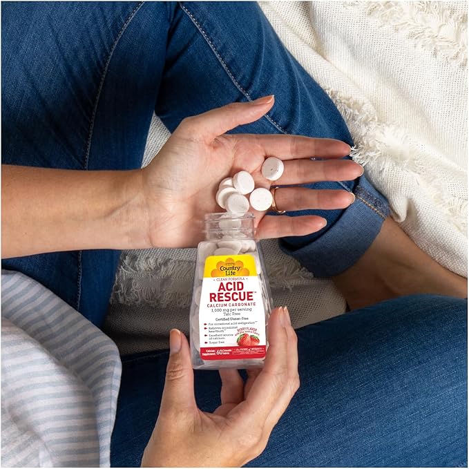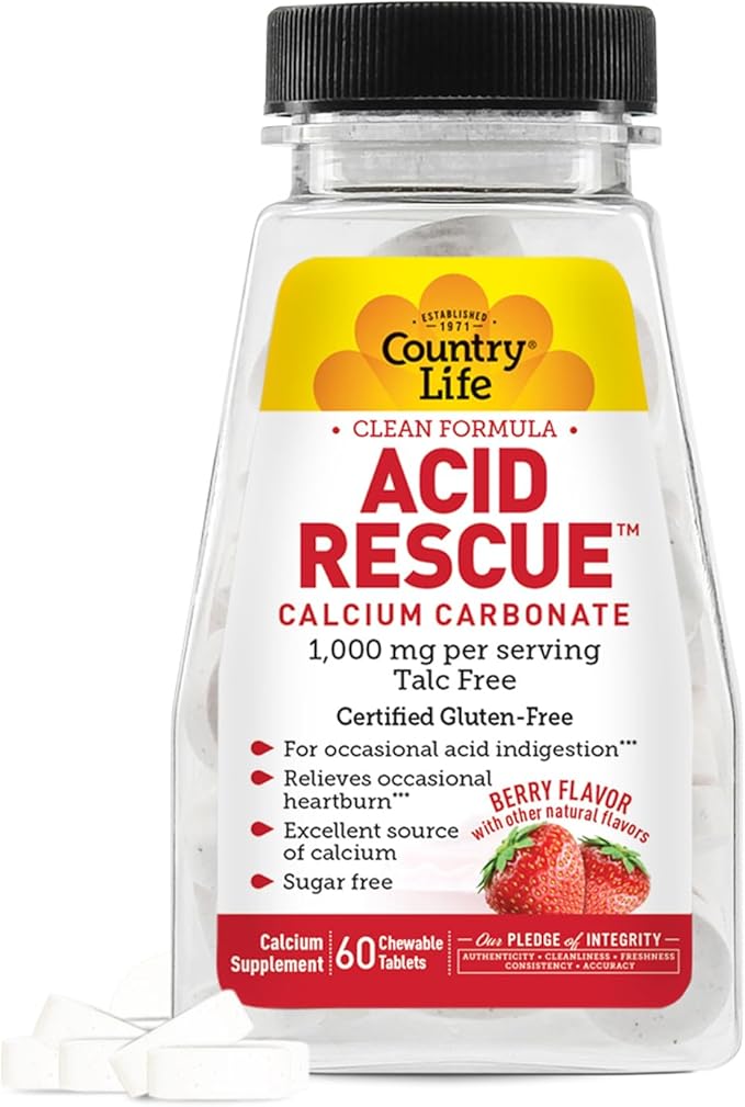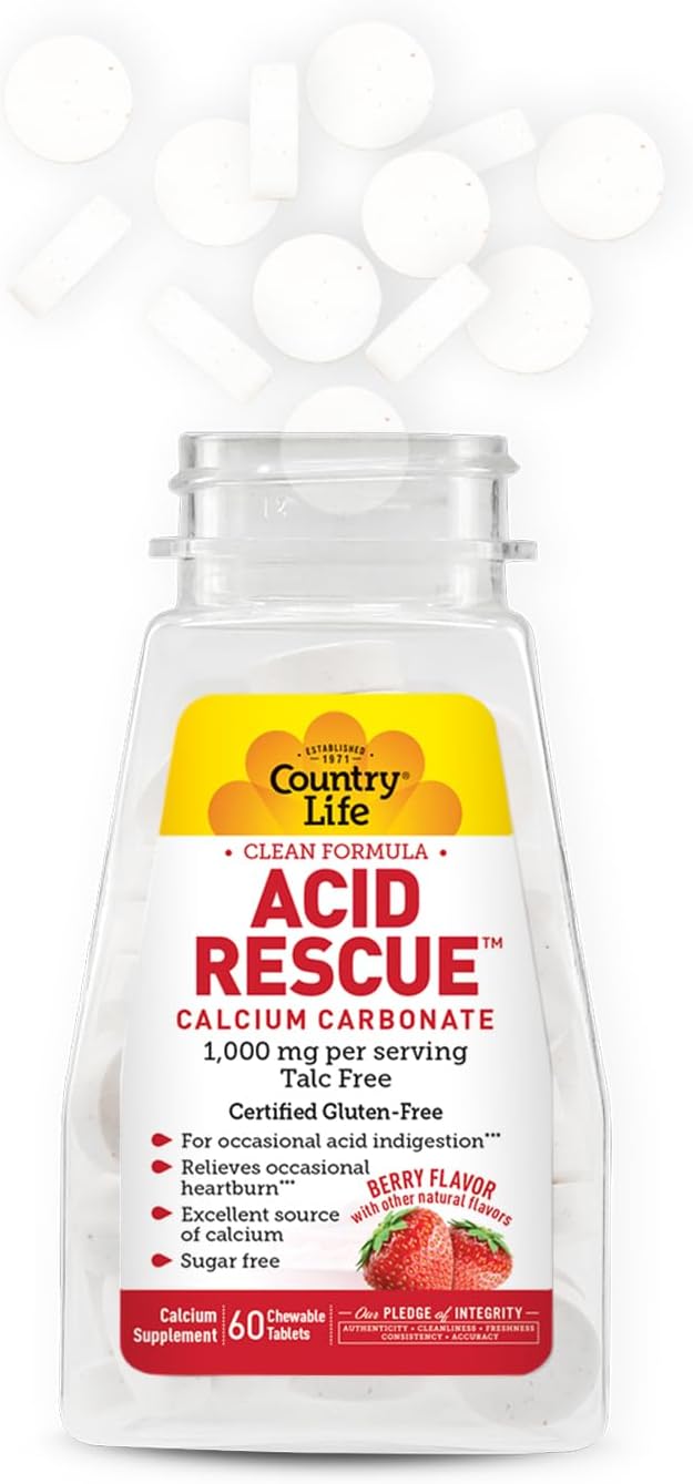 • Product Benefits : Country Life Acid Rescue Calcium Carbonate, Clean Formula, 1,000mg, Talc Free, 60 Chewable Berry Flavor Tablets, Sugar-Free, Certified Gluten Free, Certified Vegan, Non-GMO Verified Country Life Acid Rescue Calcium Carbonate, Clean Formula, 1,000mg, Talc Free, 60 Chewable Berry Flavor Tablets, Sugar-Free, Certified Gluten Free, Certified Vega… See more