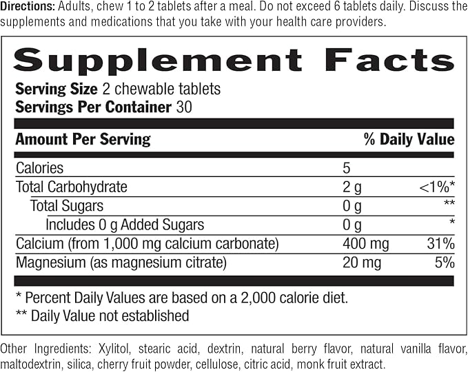 • Natural Ingredients - Made with a clean formula free from fillers like talc or cornstarch, these chewable tablets provide a natural and effective solution for heartburn relief while supporting bone health with 400mg of calcium per serving.