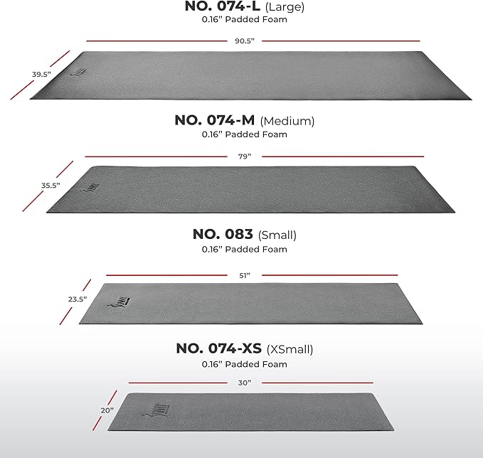 • 【VARIETY OF SIZES】 Our 4.2 mm thick mat comes in 4 sizes; easily fit any equipment of any size while keeping your room nice and tidy. EXTRA SMALL - 30 x 20 inches | SMALL - 51 x 23.5 inches | MEDIUM - 79 x 35.5 inches | LARGE - 90 x 39.5 inches.