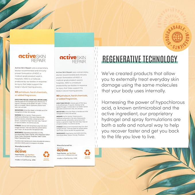 • FIRST AID HYPOCHLORUS SPRAY AND GEL: The technology used in Active Skin Repair is the same safe and gentle molecule used in hospitals & households worldwide; Hypochlorus Acid cleanse wounds to help skin recover faster