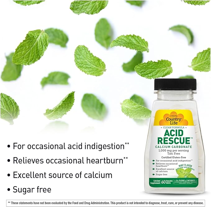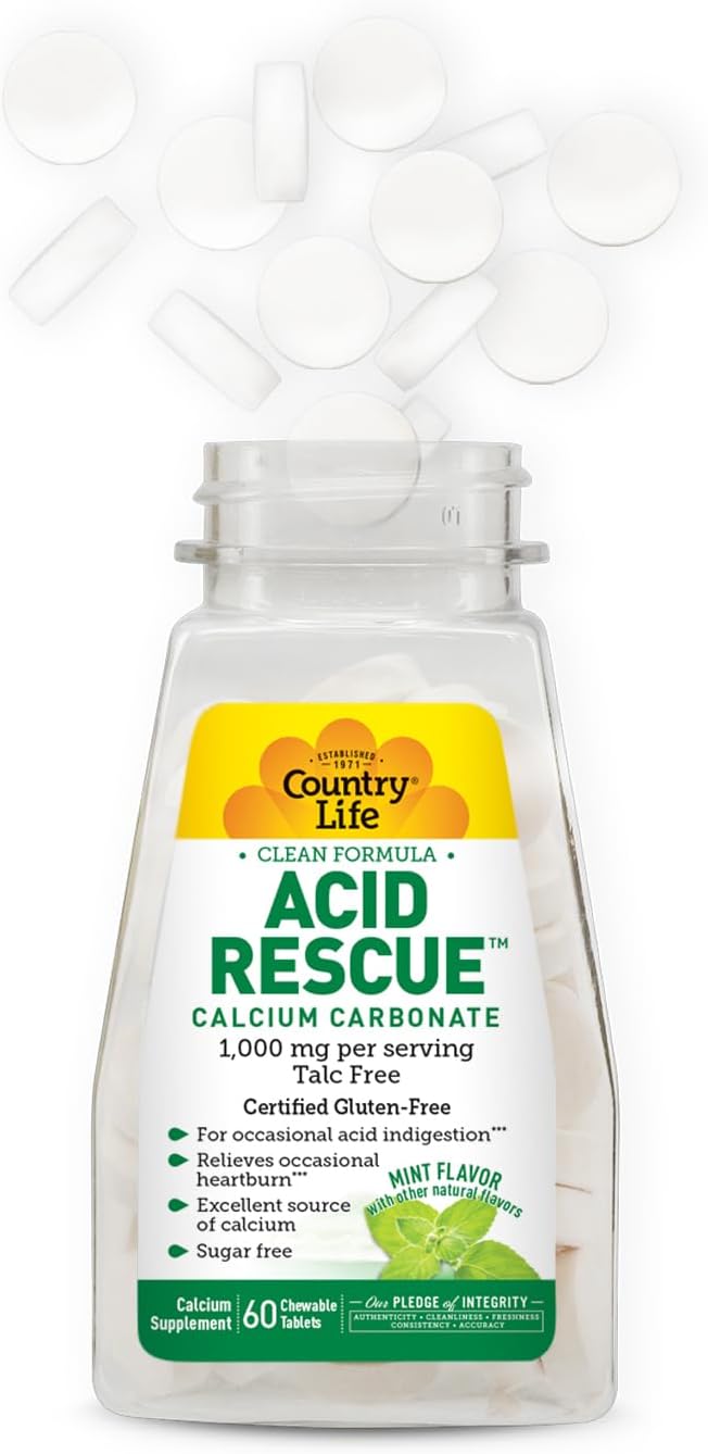 Country Life Acid Rescue Chewable Tablets - Certified Vegan & Gluten-Free Heartburn Relief, 400mg Calcium & Magnesium, Non-GMO, Sugar-Free Mint Flavor, Supports Bone Health, 60 Count