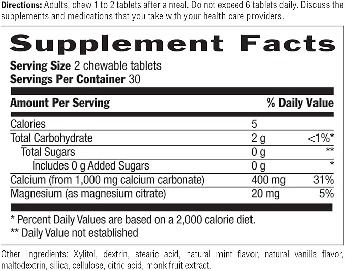 • Natural Ingredients - Made with a clean formula free from fillers like talc or cornstarch, these chewable tablets provide a natural and effective solution for heartburn relief while supporting bone health with 400mg of calcium per serving.