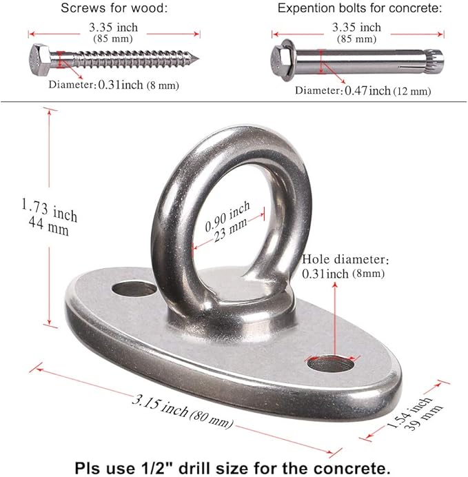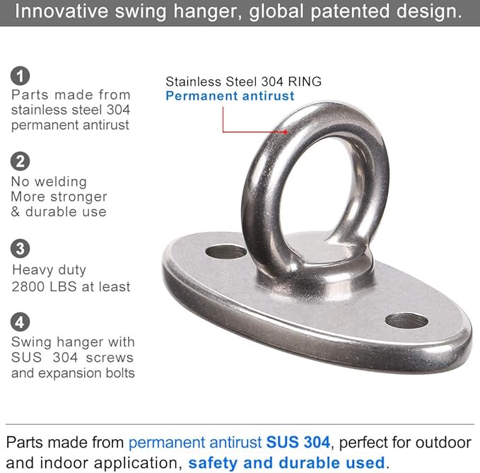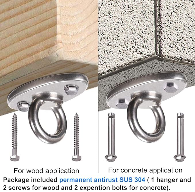 • EASY TO INSTALL: Include 2 expansion bolts and 2 wood screws. There are two holes in the base of the swing hanger, and use screws through this hole to fix it on the concrete ceiling or wooden beam. A unique one piece design and can be installed in minutes.