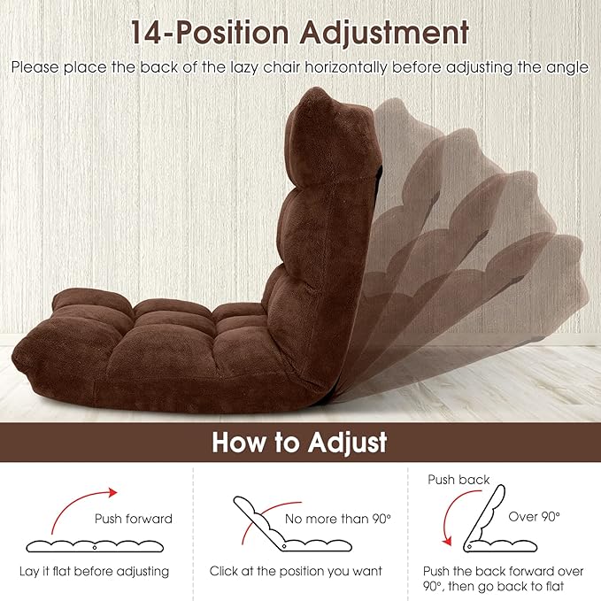• 14-level Adjustments: This floor chair features a 14-position adjustable backrest that fulfills your different needs, such as napping, reading, gaming, working, watching TV and meditation. And the fully flat position is included for better relaxation.