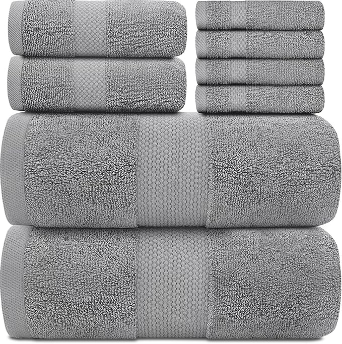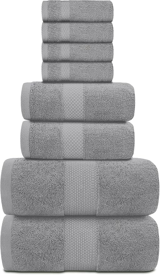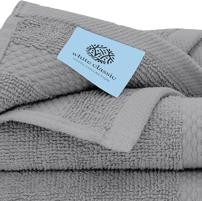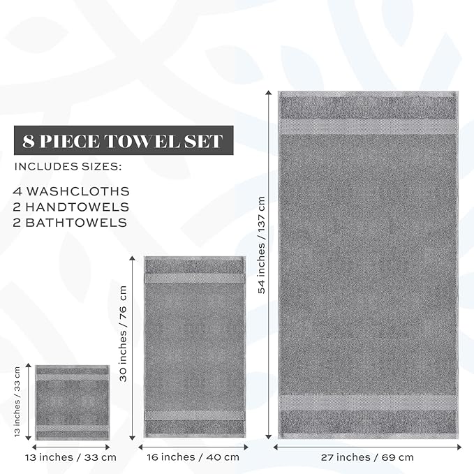 White Classic Luxury Bath Towel Set of 8 Pieces - 100% Turkish Cotton Highly Absorbent Towels for Bathroom, 2 Luxury Bath Towels 700GSM, 2 Hand Towels, 4 Washcloths, Light Gray