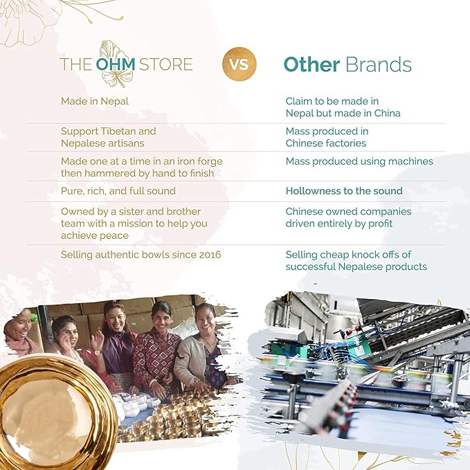 • HAND-INSPECTED AND TESTED FOR PERFECT SOUND QUALITY — The Ohm Store ensures it produces and sells only the highest quality and best playing Tibetan singing bowl sets by hand inspecting and testing each set for perfect sound quality. Our products are built to last, offering reliable use over time. Due to the handmade nature of our singing bowls, the size and shape of each one will vary slightly. There will never be another exactly like yours. The spirit of the artist is shown in the unique, one-of-a-kind detail.