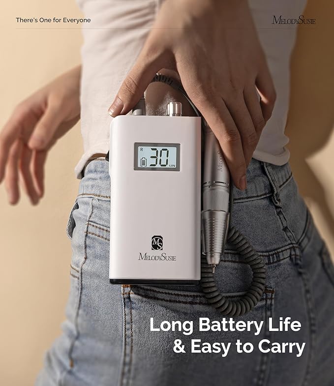 • Rechargeable and Cordless: With a large battery capacity(6000mAh), you can use this nail drill at anywhere anytime. Being fully charged for about 2.5 hours, the electric nail file will work up to 10-14 hours. The smart LCD screen will display the precious RPM and electricity. A Belt clip of the body case allows you to hang it on your belt on the waist and it is compact enough(6.08*2.94*0.98) to pack into your traveling bag or case.