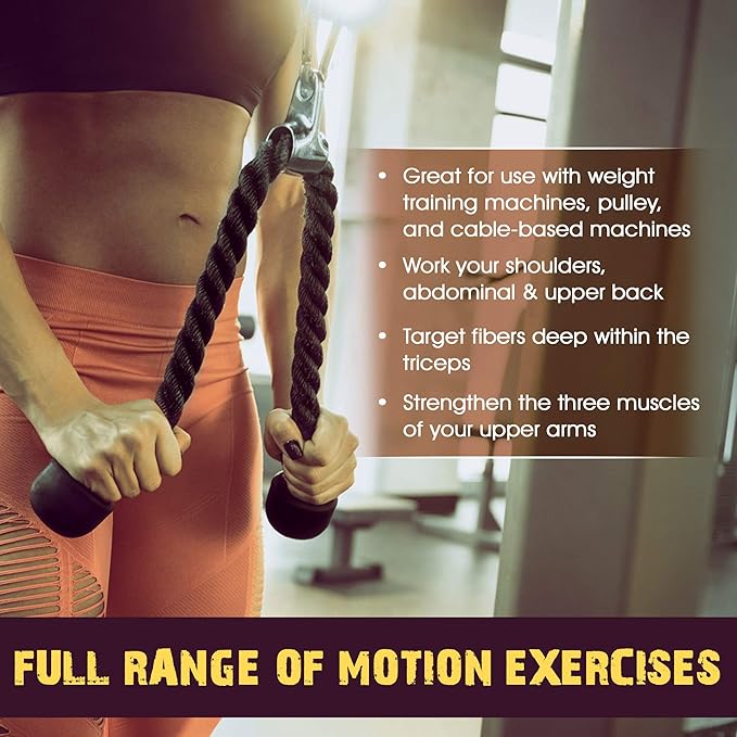 • TRICEP ROPE: Constructed of heavy-duty black nylon braided rope, Yes4All Tricep Rope is made to last. Features large rubber blocks at rope ends to provide a better, firm grip. Also comes with a chrome plated attachment to attach to cable systems