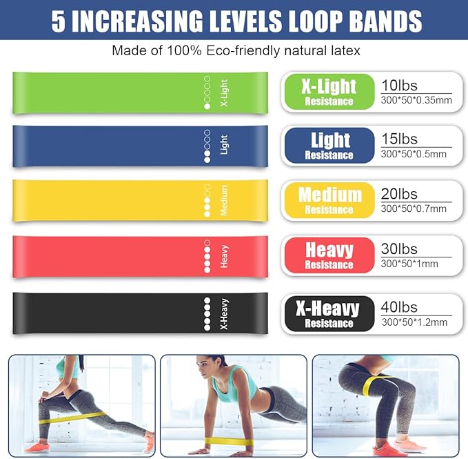 • [All in One Set]: This resistance bands set comes with 5 stackable workout bands, 5 latex resistance loop bands, 1 figure 8 resistance band, 1 jump rope, 1 hand grip strengthener ring, 1 instant cooling towel, 1 headband, 1 exercise guide, 1waterproof carrying bag, 2 cushioned soft-grip handles, 1 door anchor, 2 ankle straps. It allows you to perform variety of resistance training exercises.