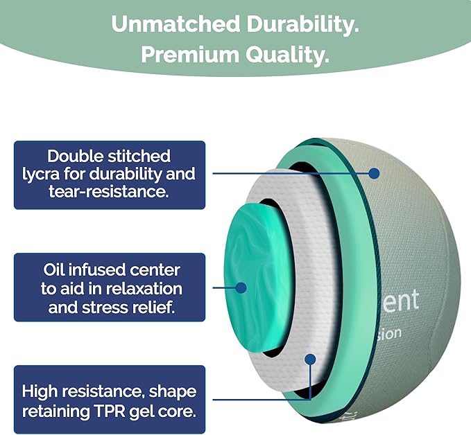 • Premium quality, ultra durable, larger sizing- Our ergonomic stress relief ball is made of a tear resistant gel core and sleek non-slip and non-stock fabric. Our inner core gel is oil infused with stimulating scents to aid in mindfulness, relaxation and stress relief.