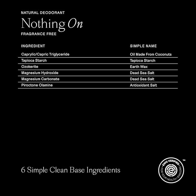 • Nothing On - This release pares it down to our core formula, leaving nothing between us but skin. Plush tapioca starch and conditioning coconut oil also give this sensitive skin deodorant a smooth glide.