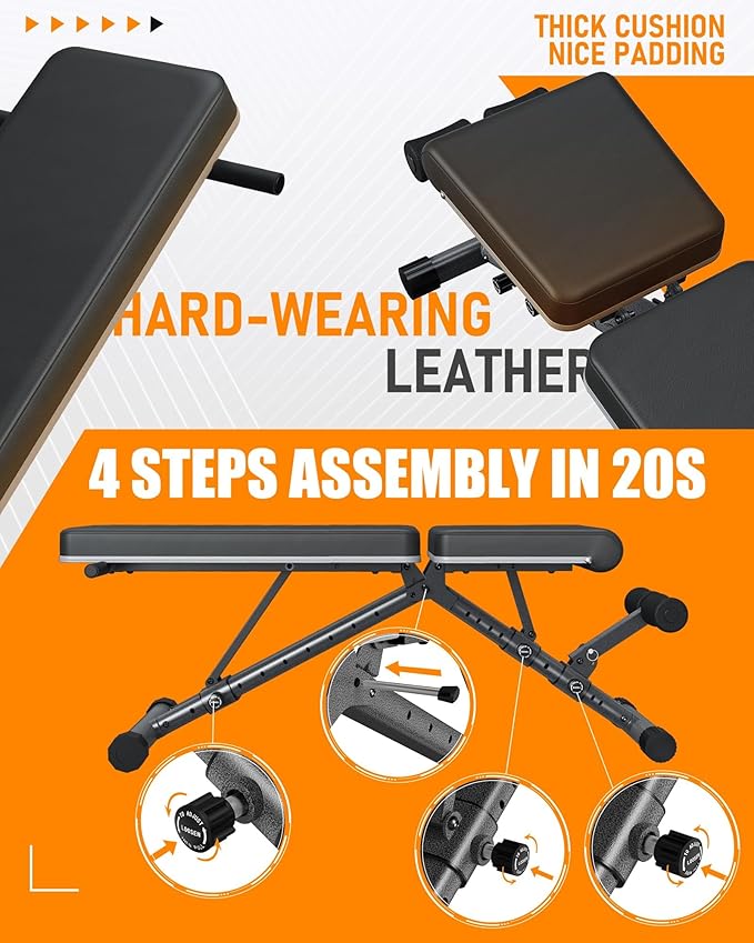 • [Minimal Gap, Four-Layer Thickened Leather Padding] Made with high-density foam cushions and exquisitely embossed leather, the sewing craft will prevent it from being easily deformed and damaged.Incorporating feedback from 1,000+ users, this exercise bench reduces the gap between the seat and backrest found in basic models. The four-layer thickened padding includes a wooden inner board and three layers of memory foam. The surface uses wear-resistant leather, tested to withstand 20,000 abrasion cycles. This is a truly comfortable and durable commercial weight bench, workout bench with weights, and reliable weight bench press station.