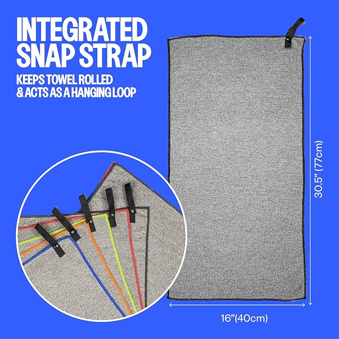 • ULTRA COMPACT, LIGHTWEIGHT, STAY CLEAN WITH HANGING LOOP: With an integrated snap strap closure that doubles as a hanging loop over the door, your backpack, or bottle. the large thin towel rolls up into a packable travel-friendly size. Perfect for anyone who travels light.