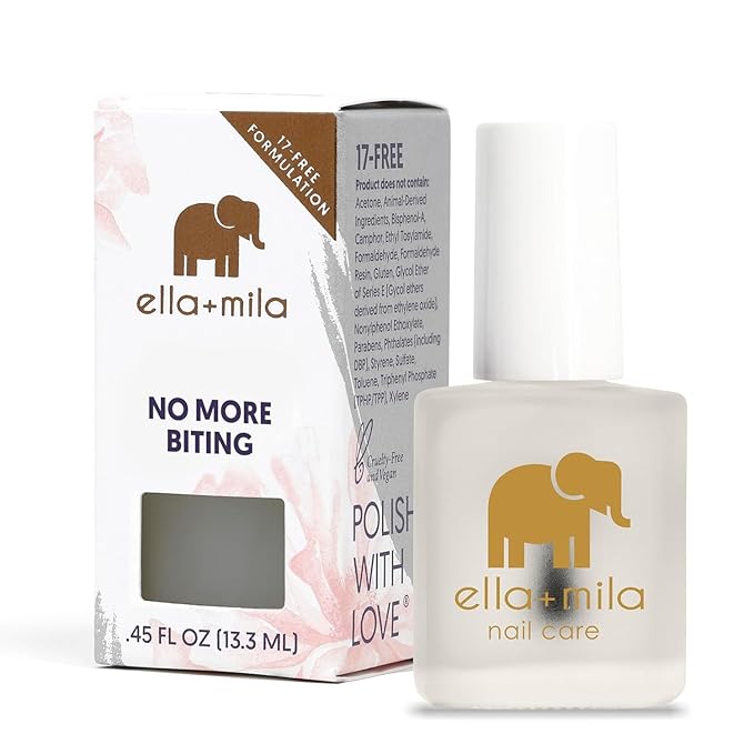 • "No More Biting" by ella+mila: Our bitter nail polish is formulated to effectively stop nail biting & prevent thumb sucking; nail biting prevention for kids, toddlers & adults.