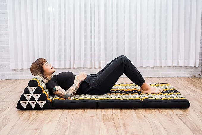• Trifold Mat with integrated Thai triangle pillow. Ideal for reading, watching TV, gaming, or as a daybed. This floor pillow lounger doubles as a Japanese futon floor mattress or thai massage mat