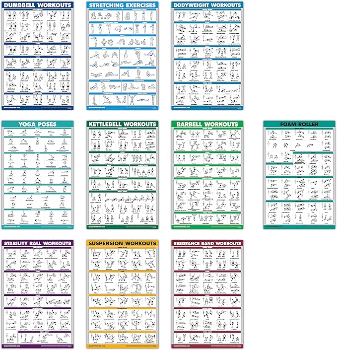 QuickFit 10 Pack - Exercise Workout Poster Set - Foam Roller, Dumbbell, Suspension, Kettlebell, Resistance Bands, Stretching, Bodyweight, Barbell, Yoga Poses, Exercise Ball (LAMINATED, 18" x 24")