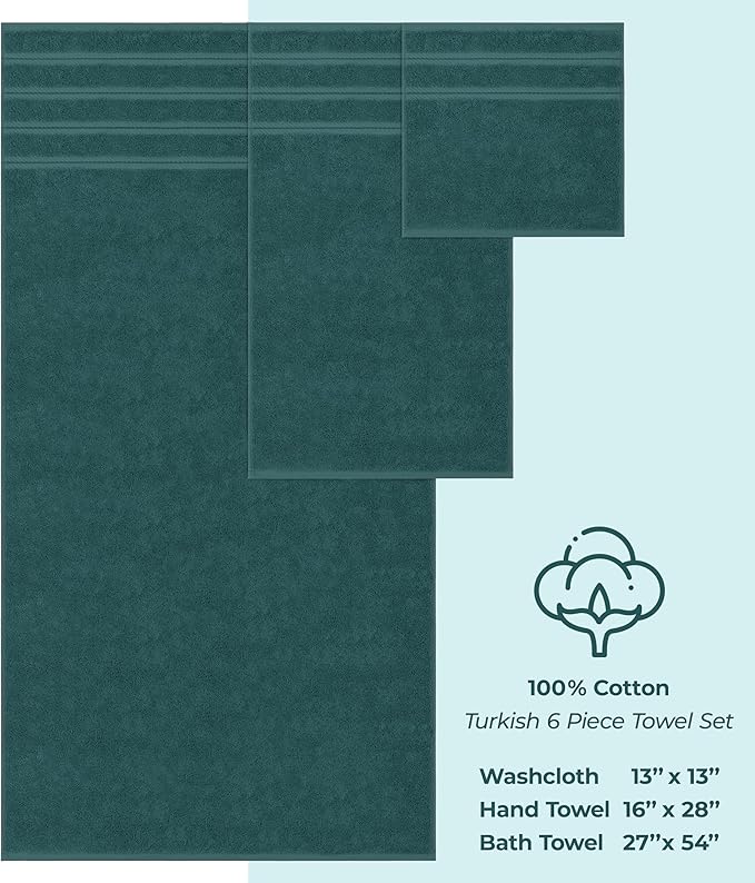 • ✅ Turkish Luxury 6 Piece Towel Set Includes 2 Bath Towels of 27 x 54 inches, 2 Hand Towels of 16 x 28 inches and 2 Washcloths of 13 x 13 inches.