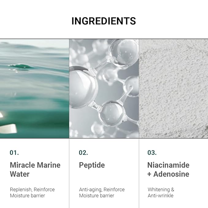 • SUPERCHARGED MARINE TREASURE: Miracle Marine Water (51% algae extract), Peptides & Niacinamide work together to deeply nourish, hydrate, and smooth the skin, tackling dryness and wrinkles at their source.