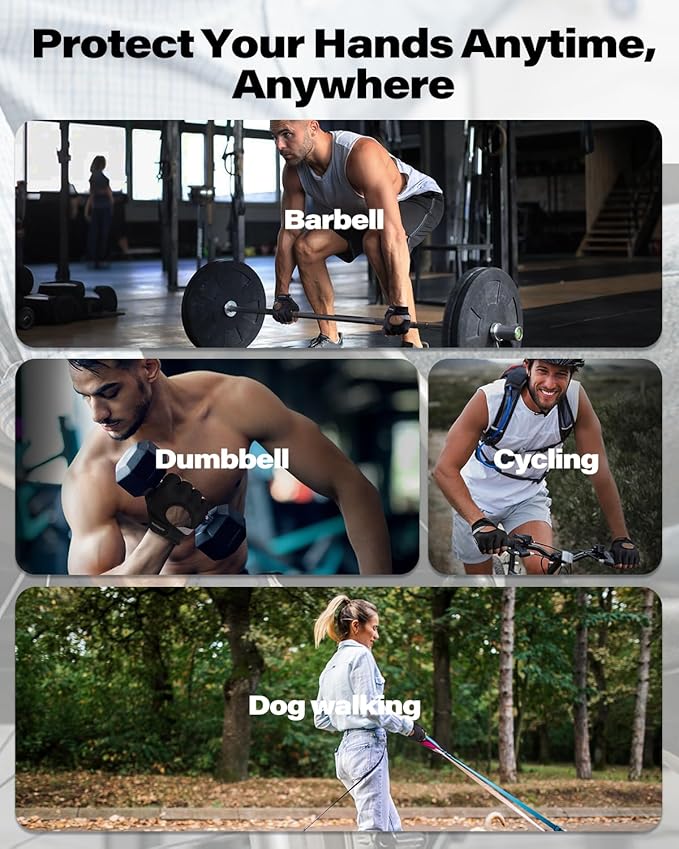 • Easy on Easy off: The weight lifting gloves feature a hook & loop closure, a curved bottom on the back, and tabs on middle and ring fingers to allow you to adjust them and take them on and off in seconds pre- and post-workout. The short wrist strap leaves room for fitness tracker to track your performance effortlessly no matter whether you are doing pull-ups, battling ropes, or lifting dumbbells and barbells in the gym; or cycling, hiking and rowing outdoors.