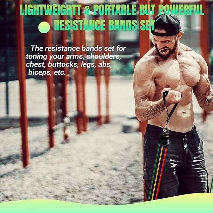 • [Perfect Workout Set & Brand Service] Our resistance bands set with door anchor contains 5 latex tubes in different colors, 2 cushioned handles, 2 ankle straps, 1 Training Poster, 1 carrying bag, and 1 exercise guide. We stand by our resistance bands set with our outstanding customer service, If you have any problems, please don't hesitate to contact us.