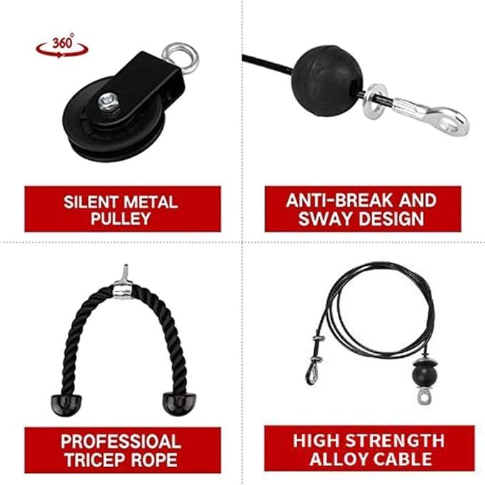 • 【High Strength Cable】: Using 80 inches (thickness: 0.2 in) high-strength sheathed cable materials, with good durability, providing smooth operation. The cable pulley system is made of sturdy steel, which is wear-resistant and reduces friction. 360 degree silent rotation traction wheel can ensure that no other noise is generated during operation.