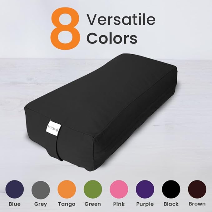 • Perfect Size and Color Meditation Bolster: Our rectangular bolster pillows come in two sizes, 28" x 12" x 8" and 26" x 8" x 5". This firm yoga pillow is available in grey, green, tango, brown, black, pink, purple, and navy blue.