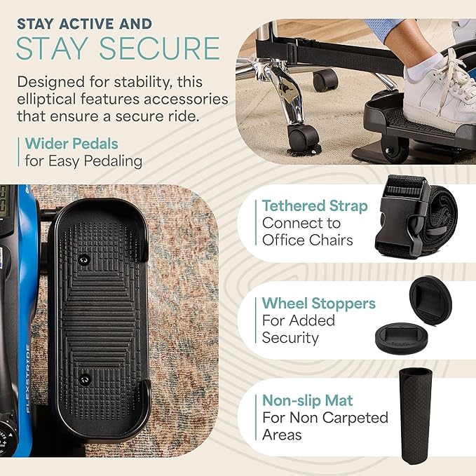 • ALL-IN-ONE KIT: Our FlexStride Plus comes with an exercise mat, tether strap, yoga resistance band, and wheel stoppers for added stability. This full set transforms your ellipse leg exerciser as seen on TV into a complete solution.