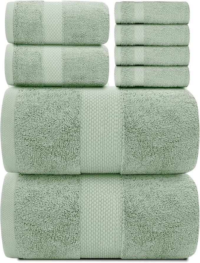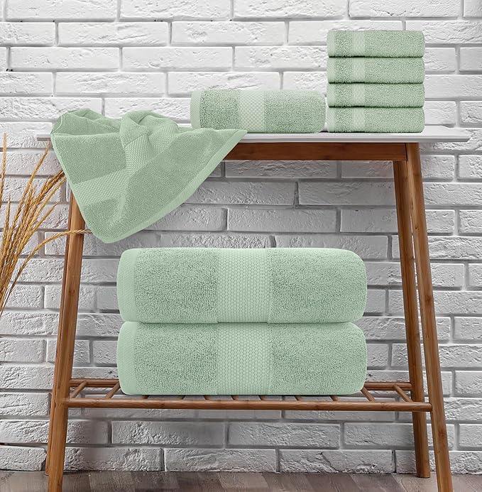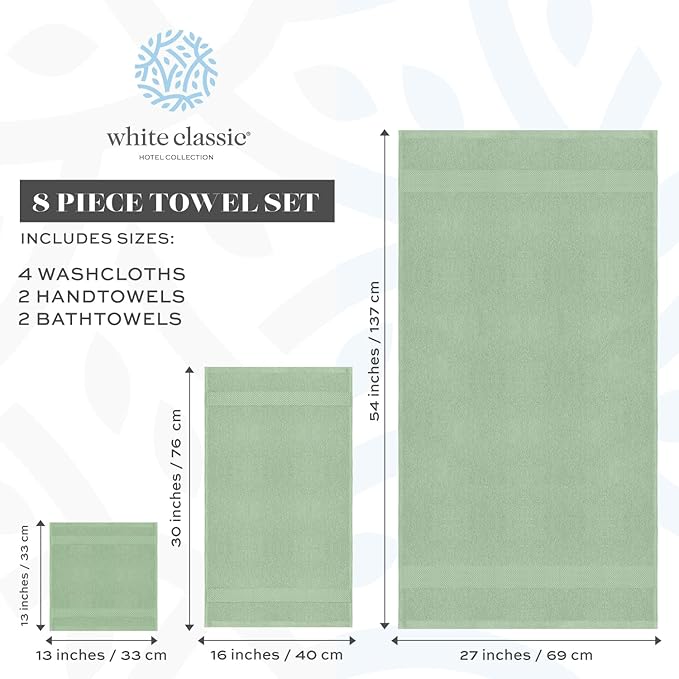 White Classic Luxury Bath Towel Set of 8 Pieces - 100% Turkish Cotton Highly Absorbent Towels for Bathroom, 2 Luxury Bath Towels 700GSM, 2 Hand Towels, 4 Washcloths, Green