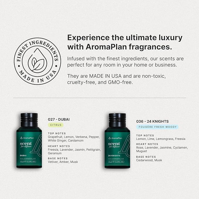 • ULTIMATE AROMA EXPERIENCE includes the AromaPlan scent home machine, designed to efficiently cover an area of 1,500 to 2,000 Sq Ft, ensuring your space is filled with aroma in minutes. Paired with the AromaPlan's Top Picks Fragrance Kit, this set features two meticulously crafted scents: Dubai, and 24 Knights in 1.5 fl.oz (45 ml) bottles. Perfect for choosing your favorite aroma and transforming any large space into a fragrant haven instantly.
