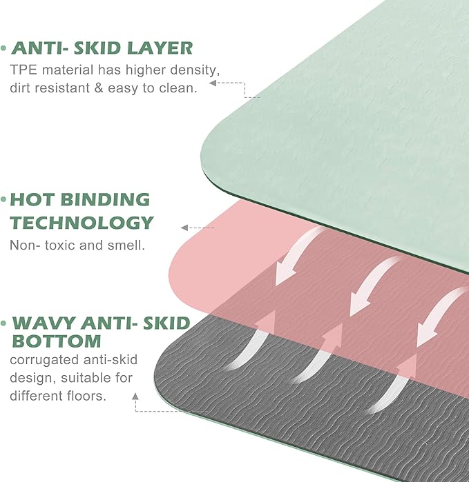 • DOUBLE NON-SLIP DESIGN - This workout mat has double-sided non-slip surfaces. Wavy undersides make excellent traction on the floor. It unrolls pretty flat and stays put. Special textured surface prevents your hands and feet from sliding when you sweat on it.