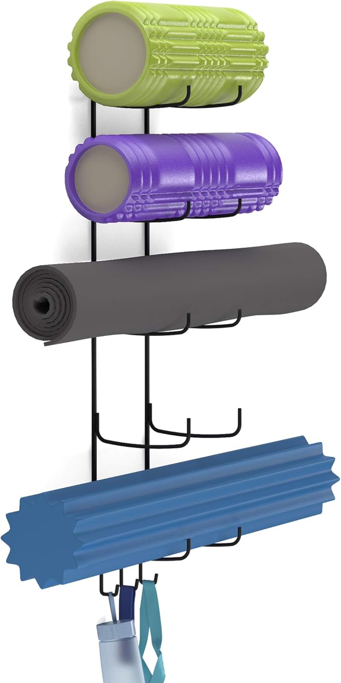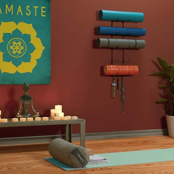 Wallniture Guru Yoga Mat Holder Wall Mount with 3 Hooks for Hanging Yoga Strap, Resistance Bands, 5-Sectional Metal