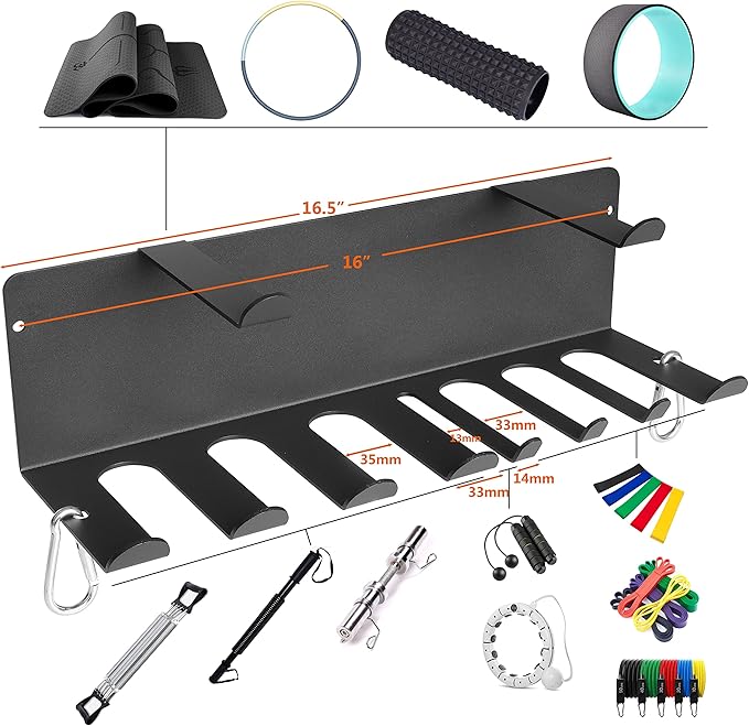 • The size of the rack is 16.5"(L) x 5.5"(W) x 4.5"(H). 8 prongs and 2 foam rollers hooks can store a lot of fitness equipment