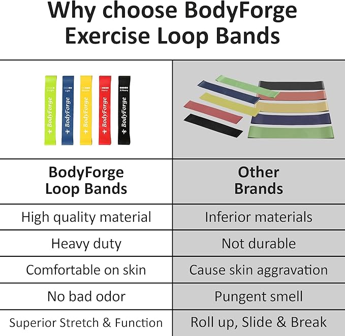 • PREMIUM EXERCISE BANDS: BodyForge heavy duty loop resistance bands come in 5 varying resistance levels(10-15-20-30-40lbs). The 12″ by 2″ bands offer a great variety of exercise options whether you are just beginning your workout journey or been working out for years.