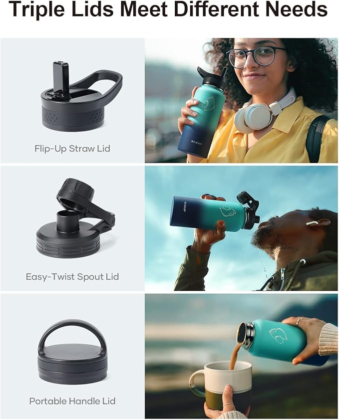 • 3 Caps Pack, 100% Leak-Proof: BUZIO stainless steel water bottle comes with 3 lids: portable handle lid, easy-twist spout lid, and flip-up straw lid to meet camping, hiking, cycling, fitness sports and more. Each lid has a thickened 360° seal for 100% leak-proof.