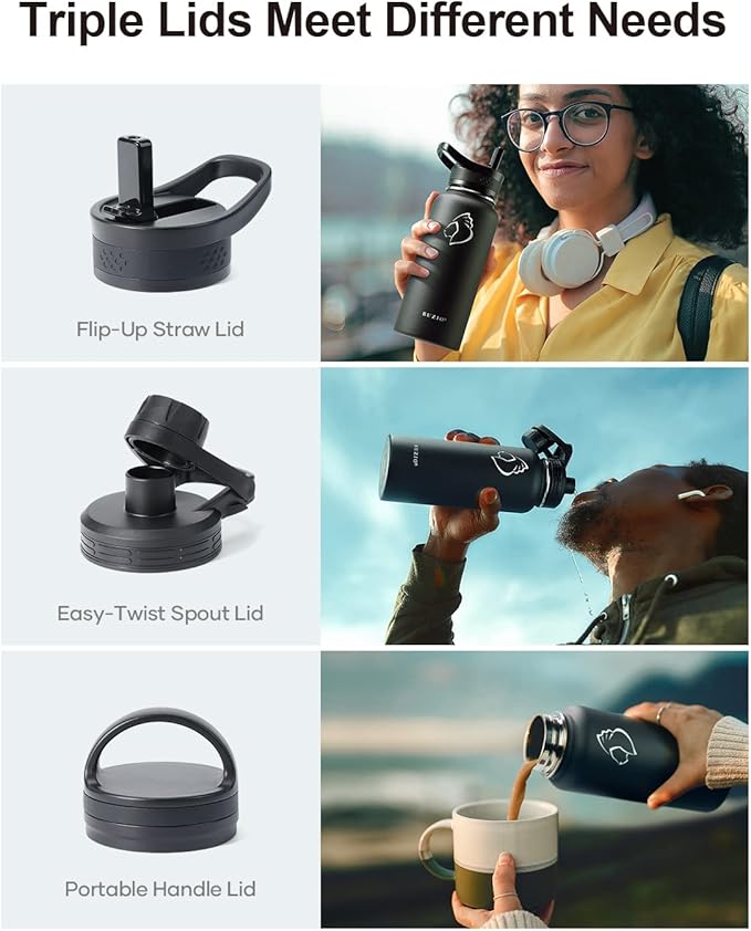 • 3 Caps Pack, 100% Leak-Proof: BUZIO stainless steel water bottle comes with 3 lids: portable handle lid, easy-twist spout lid, and flip-up straw lid to meet camping, hiking, cycling, fitness sports and more. Each lid has a thickened 360° seal for 100% leak-proof.