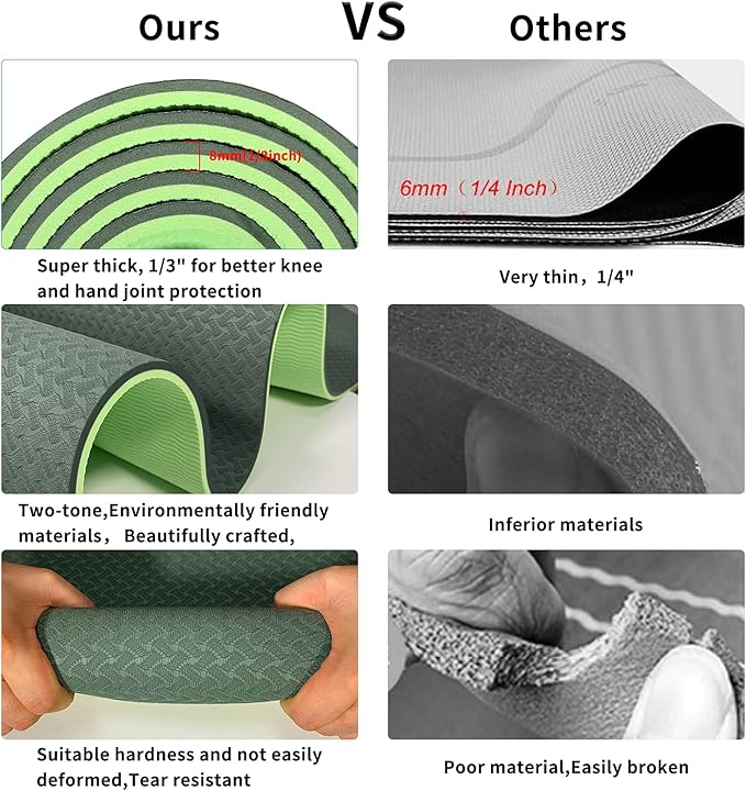 • 【8mm thickness, very suitable for yoga beginners】Size: 72inch x 24inch x 1/3inch, 8mm thickness is light and comfortable, excellent flexibility, 8mm thickness can provide the best level of cushioning and protection for the joints and knees, at the same time It still allows you to hold on to the floor to keep your balance. Protect the safety of yoga lovers.