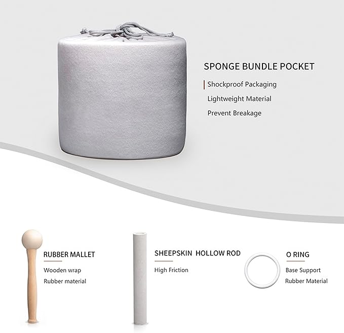 • Usage Method: We recommend you to use the singing bowl in a quiet space, you will feel a more impactful auditory touch! First, you can place the O-shaped rubber ring on a flat surface, then place the sound bowl on it, grip the mallet or hammer, gently tap the outer edge of the bowl, and then continue to slide the edge around the mallet constant, pressing hard to continue the sound. Take care to exert gentle force and keep a certain distance from the bowl to avoid unnecessary disturbing sounds.