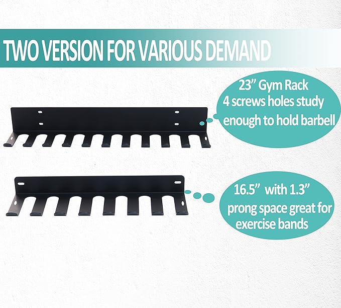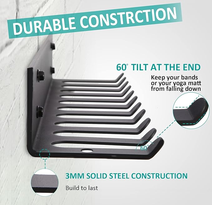 • MULTI-PURPOSE GYM ORGANIZER-23inch Lx 5 inch Wx 2 inch H, 5 inch Long and Strong 11 prongs make it great resistance band holders,Jump Rope Holders,Workout Belts,form roller and yoga mat Storage.60°angled lip on the end to prevent your gym equipment from falling