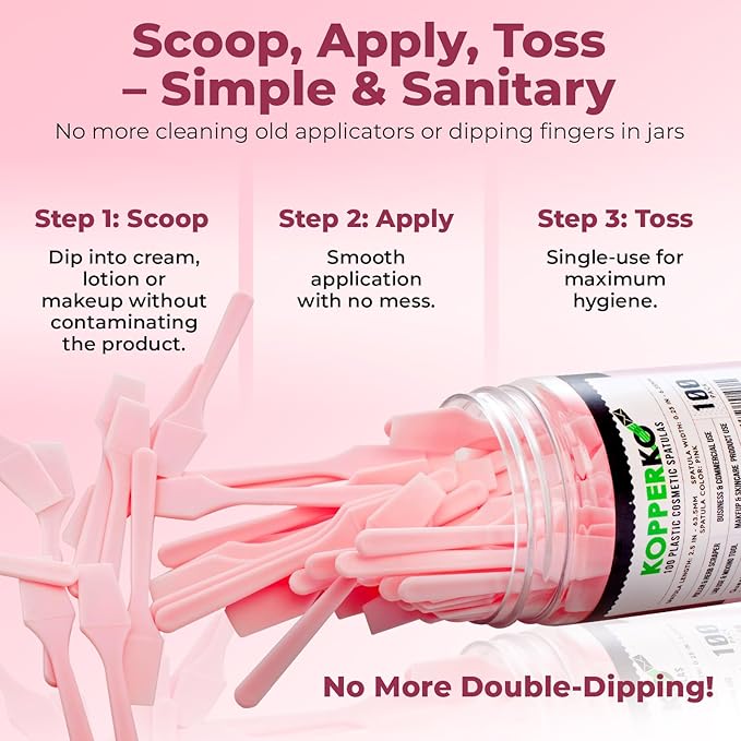 • Clean Out Your Containers: Maximize product use with our 100 pack of 0.25"x2.5" disposable small skincare spatulas. Easily extract creams, lotions, or makeup from containers, even in tight spaces, without getting product under your nails