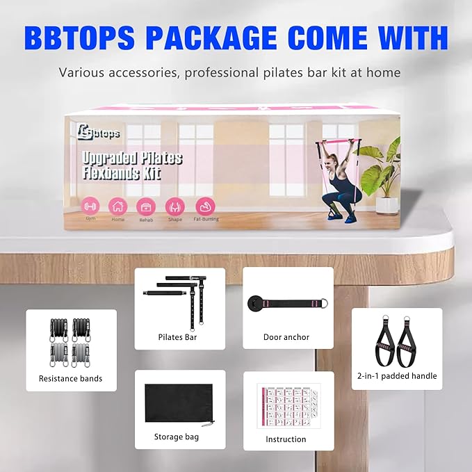 • 【Bbtops Pilates bar 】- Pilates Bar Kit with Resistance Bands composed of three steel pipes,four resistance bands equipped are made of natural latex, upgraded adjustment buckle and nylon rope with clear graduations. Just press the button easily, you can adjust the nylon rope to the desired length more quickly and accurately when training different movements. It can help you improve your strength, flexibility, and balance. which is strong, durable, and non-slip.
