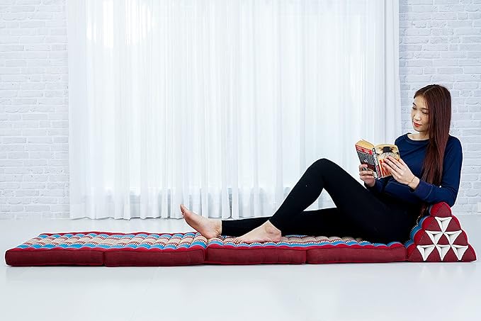 • 4 fold Mat with integrated Thai triangle pillow. Ideal for reading, watching TV, gaming, or as a daybed. This floor pillow lounger doubles as a Japanese futon floor mattress or thai massage mat