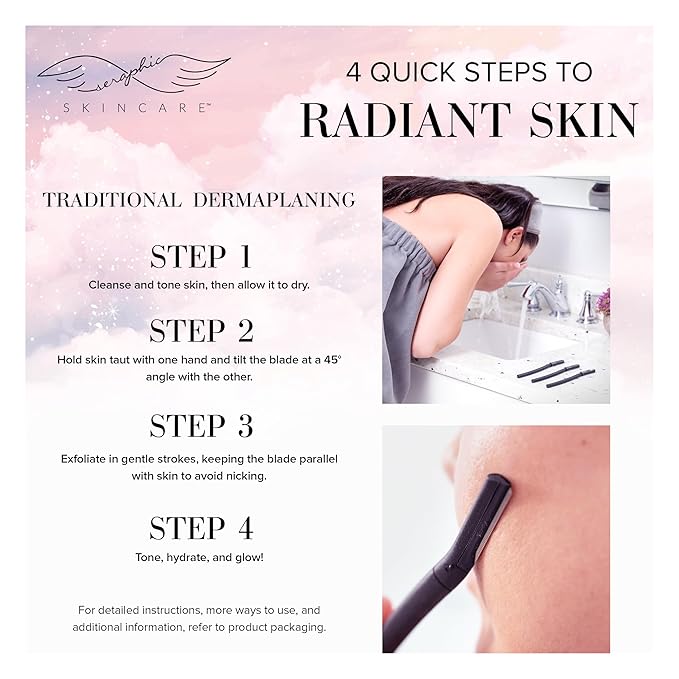 • DERMAPLANE WITH CONFIDENCE – Our razor blades makes dermaplaning a snap for beginners; the sharp yet guarded blade gently glides yet effectively exfoliates layers of dead skin. Plus, it couldn't be easier to use – simply follow our step-by-step instructions included on the packaging for immediate results you'll love.