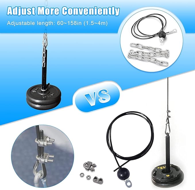 • πŸ’ͺ【2 Steel Wire Ropes】 1.5m cable + 1.8m cable, used together with the iron chain presented, the use range can reach 1.5 to 4 meters, fully meeting different fitness needs.