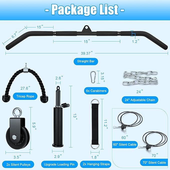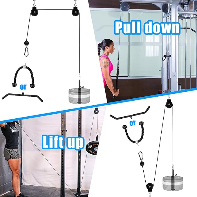 • πŸ’ͺ【Detachable Handles】 We provide triceps rope and straight bar, allows you to freely change the attachment you want. You can train triceps, biceps, forearms, legs, shoulders, and back. Such as Triceps Pull Down, Biceps Curl, Lat Pull Down, Row, Fly.
