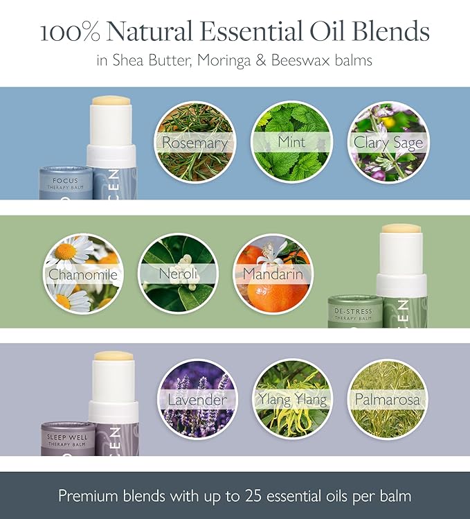 • Premium Essential Oil Blends: 100% Natural – 'Sleep Well' combines Lavender, Ylang Ylang, and Palmarosa as a natural sleep balm, 'De-Stress' blends Chamomile, Neroli, and Mandarin for anti-stress support, and 'Focus' features Rosemary, Mint, and Clary Sage for enhanced concentration. All balms are in a Shea Butter and beeswax base. Cruelty free and vegetarian-friendly.