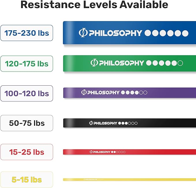 • Achieve the next level: Effectively boost your goals for next level fitness for chin ups, pull ups and a variety of strength training moves. The Philosophy Gym Resistance Bands are each sold separately.