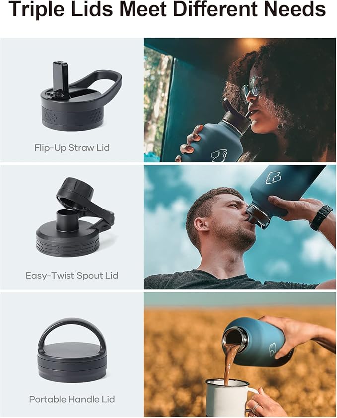 • 3 Caps Pack, 100% Leak-Proof: BUZIO stainless steel water bottle comes with 3 lids: portable handle lid, easy-twist spout lid, and flip-up straw lid to meet camping, hiking, cycling, fitness sports and more. Each lid has a thickened 360° seal for 100% leak-proof.