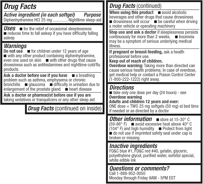 • Each softgel of this adult sleep aid contains diphenhydramine hydrochloride 25mg as the active ingredient