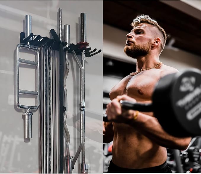 • Versatile Storage Rack: The gym storage rack allows you to hold multiple gym items (Barbells and weight vests, resistance bands, tricep pulldown, cable attachments, ankle weights, lat pull-down bar, power belts, gym bags, massage rollers, yoga mats, yoga straps, jump ropes, etc.), effectively freeing up your space.Please note that this rack is not suitable for barbells with handles diameter greater than 1 1/8" wide as this is the gap between the hooks.